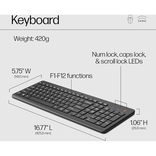 HP - مجموعة كيبورد وماوس لاسلكية اتش بي 330 - مستقبل USB لاسلكي 2.4 جيجاهرتز - مفاتيح شيكليت 12 اختصار للكيبورد - ماوس متعدد الاسطح 1600 نقطة لكل بوصة - قفل ارقام LED وقفل اغطية التمرير 2V9E6AA أسود
