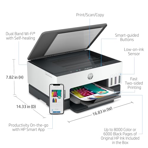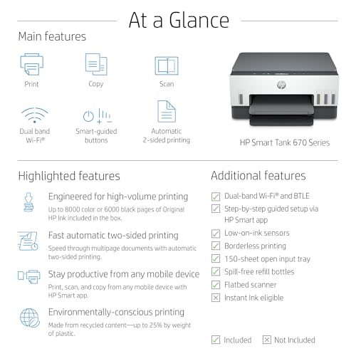 HP - طابعة سمارت تانك 670 من اتش بي متعددة الوظائف للطباعة والمسح الضوئي والنسخ لاسلكية مسح إلى PDF طباعة سريعة على الوجهين تصل 18 000 صفحة بالأبيض والأسود أو 8 ملونة- أبيض/رمادي [6UU48A]