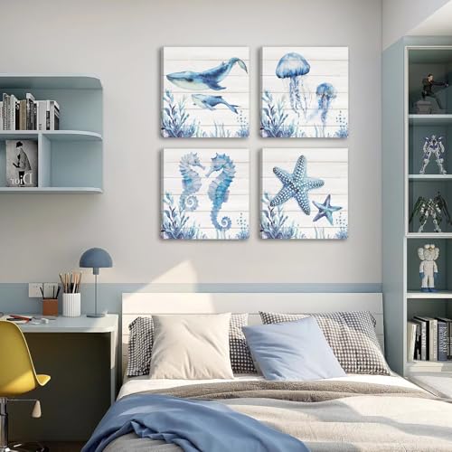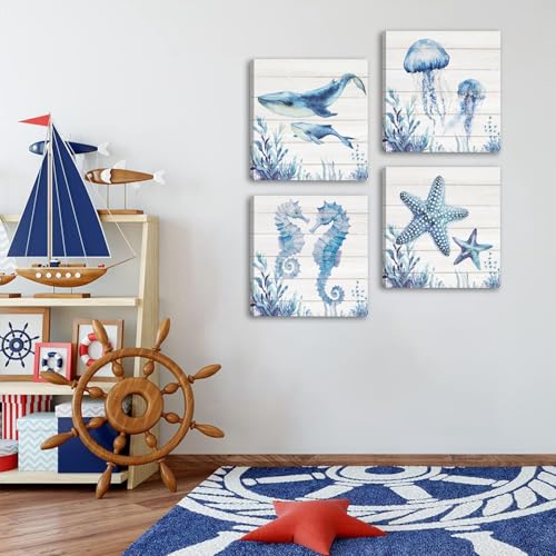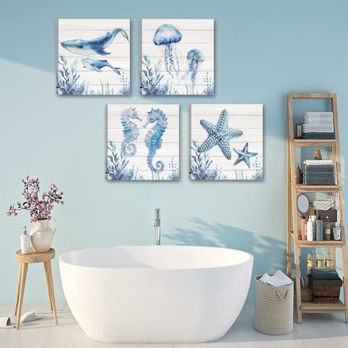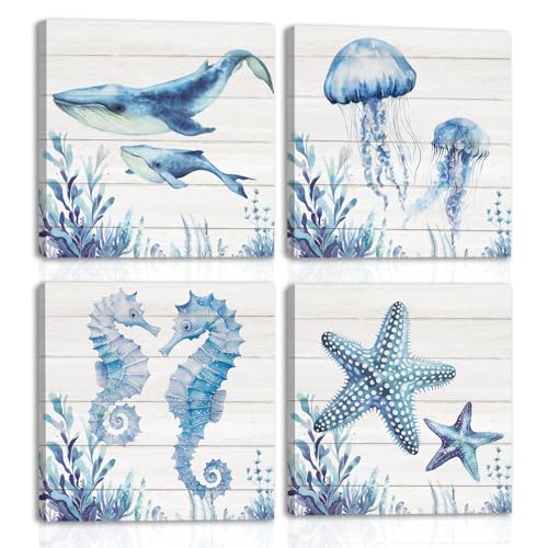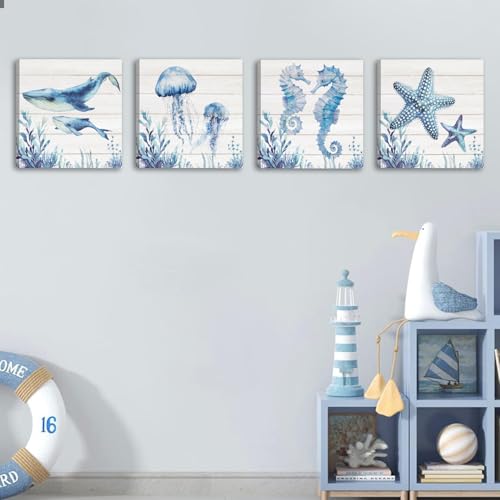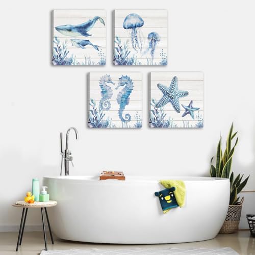 HPNIUB - لوحة فنية جدارية قماشية للحمام من اتش بي ان اي يو بي، بتصميم سمكة قرش زرقاء وسلاحف البحر ونجم البحر وقنديل البحر وقنديل البحر، ديكور حائط للحمام وغرفة الاطفال بطابع المحيط الازرق