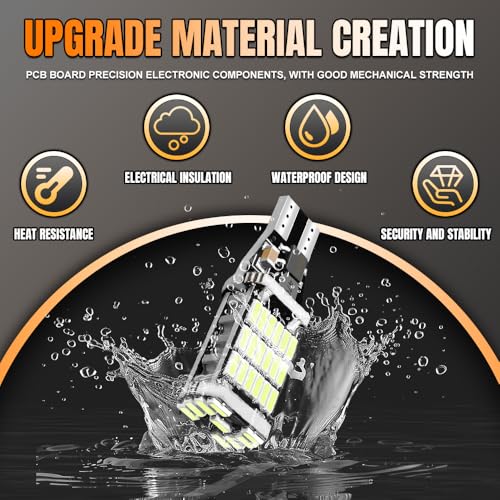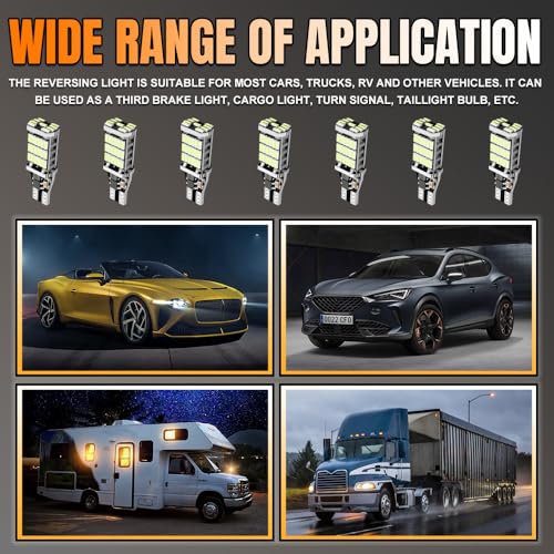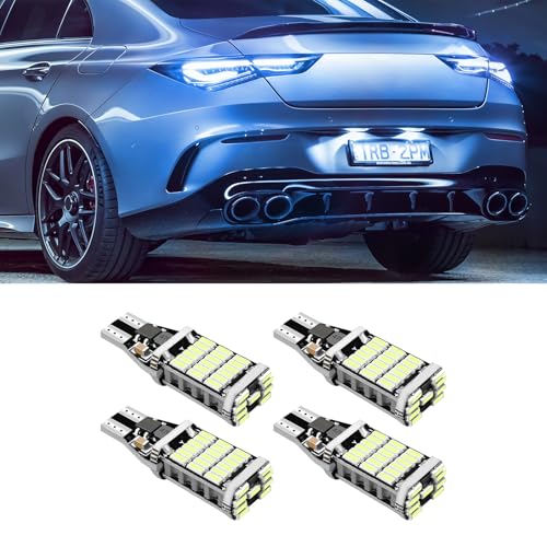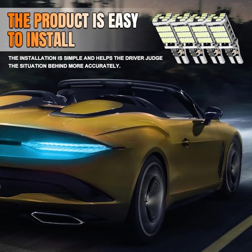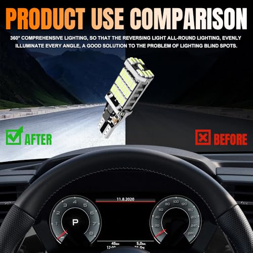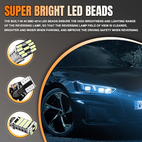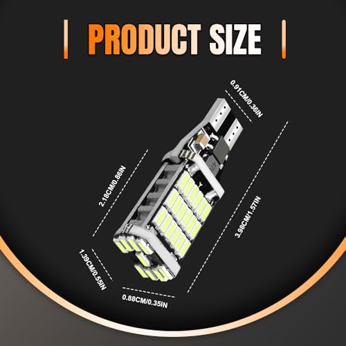 - محتويات العبوة: سوف تحصل على أربعة لمبات عكسية بيضاء T15 4014 45SMD بدون خطوات وفك تشفير عالي السطوع. تعتبر هذه المصابيح العكسية كافية للاستخدام اليومي والاستبدال وهي مثالية لترقية مخزونك من لمبات الهالوجين العكسية الباهتة.