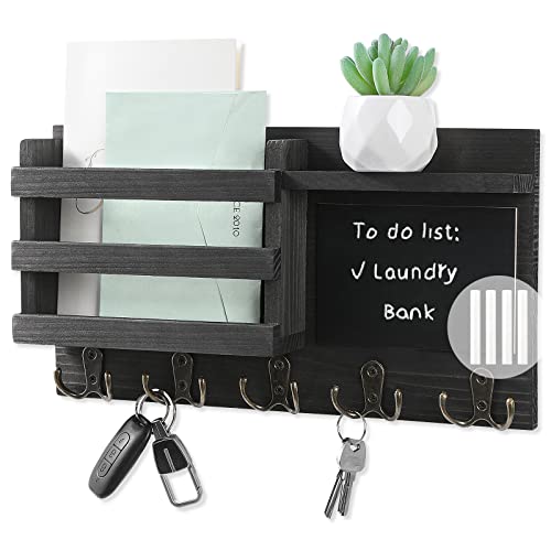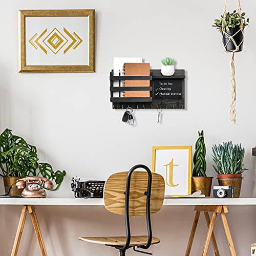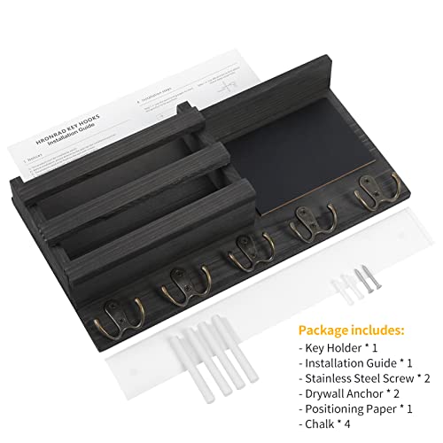 HRONRAD - Key and Mail Holder for Wall, Farmhouse Wall Mounted Key Hooks with Floating Shelf,Wooden Hanging Key Organizer Storage, 5 Double Hooks and Blackboard for Entryway (Black)