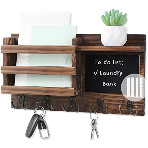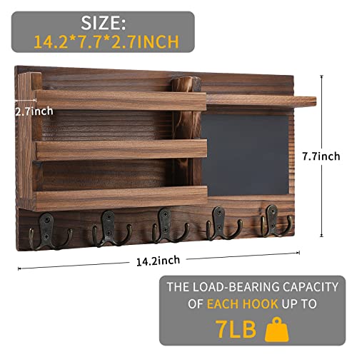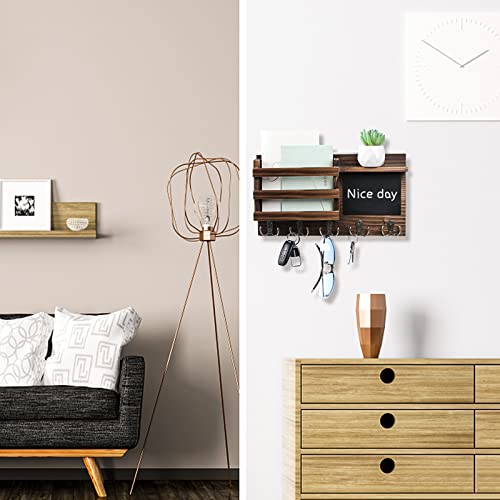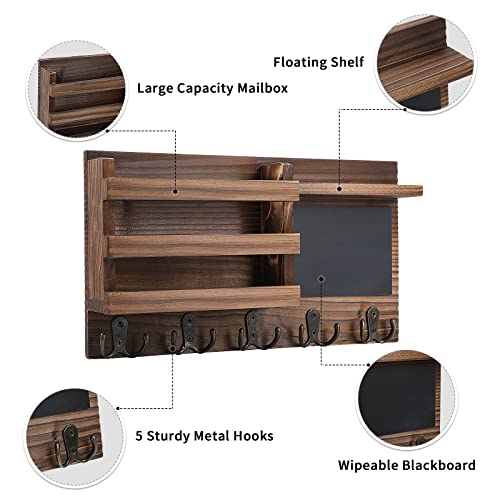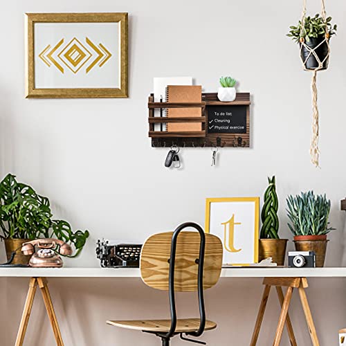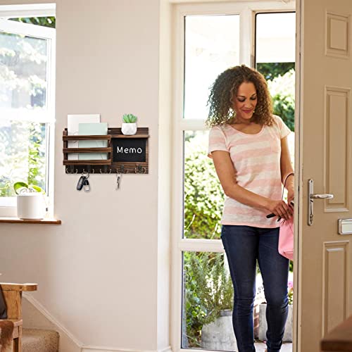 HRONRAD - Key Holder for Wall Decorative, Farmhouse Wall Mounted Mail Sorter with Floating Shelf, Wooden Hanging Key Organizer Storage, 5 Double Hooks and Chalkboard for Entryway (Brown)