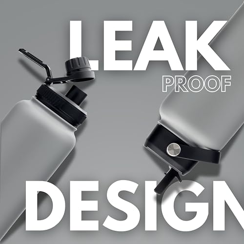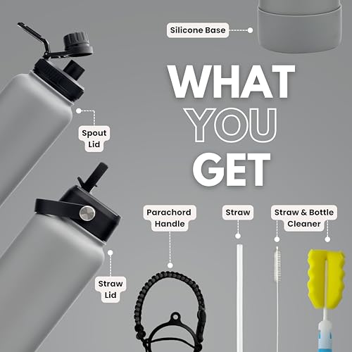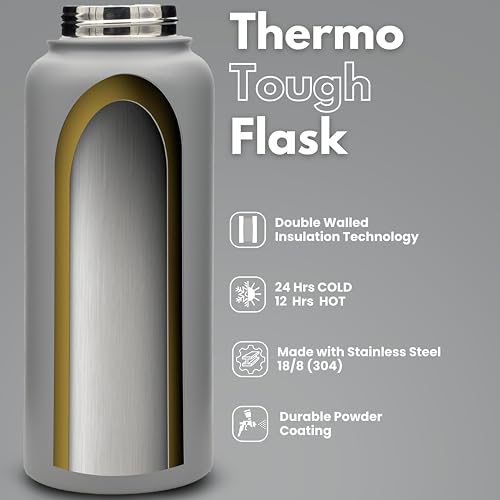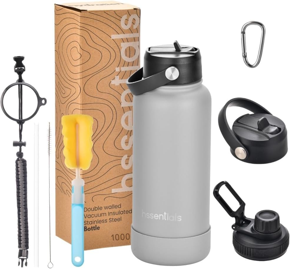Hssentials - Stainless Steel Water Bottle Flask Double-Walled Vacuum-Insulated 2 Lids Eco-Friendly Perfect for Cold & Hot Drinks On The Go 100% Leakproof - Gym, School, Travel (Grey, 1000ml (34oz))