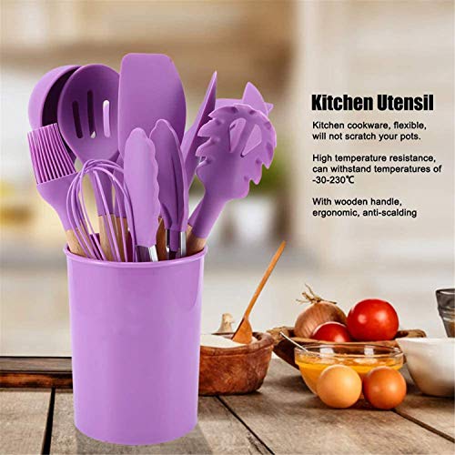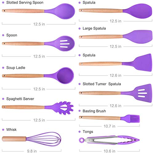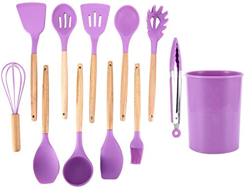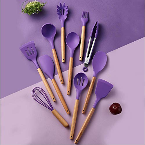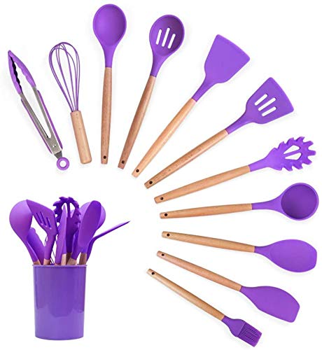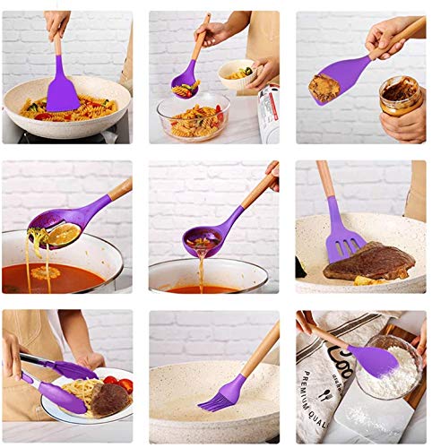 HUBEI - أدوات طهي سيليكون مقاومة للحرارة حتى 446°F من هوبي، مساكة تقليب وملعقة سباتولا وملعقة عميقة مسطحة وفرشاة وخفاقة رمادي ومقابض خشبية للاواني المانعة للالتصاق (ارجواني-12 قطعة)