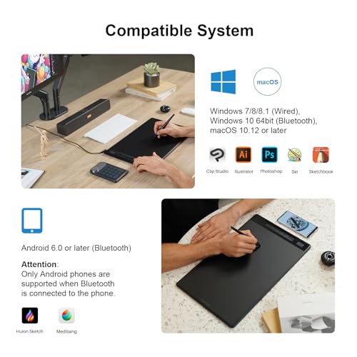 - ✔️Great Compatibility: the graphics tablet G930L can work seamlessly with devices running Windows, Mac, ChromeOS, and Android 6.0 or later. It is well compatible with most creative software like Adobe Photoshop, Illustrator, Clip Studio Paint, SAI, etc. It is also a convenient tool for e-learning, remote teaching and web conferencing, etc.