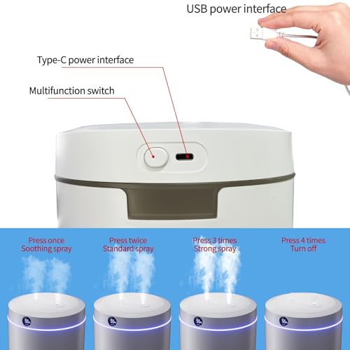 - Type-C Power Port and User-friendly Design: The air humidifier is plugged in with a 1 meter long type-c cable for easy connection. User friendly controls, only one switch, press to open, press again to adjust the steam strength. Simple cleaning, directly open the cover, ensure that the power supply port does not touch the water.