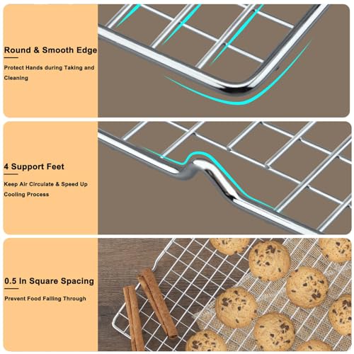 - Accelerated cooling: the 0.5 inch x 0.5 inch grid spacing makes it easier to drain grease efficiently while preventing food mishaps. Supported by 0.5 inch legs, the wire mesh for cooling rack is raised to improve airflow to ensure even baking, speed up the cooking process, save time on repeated baking and speed up the cooling phase.