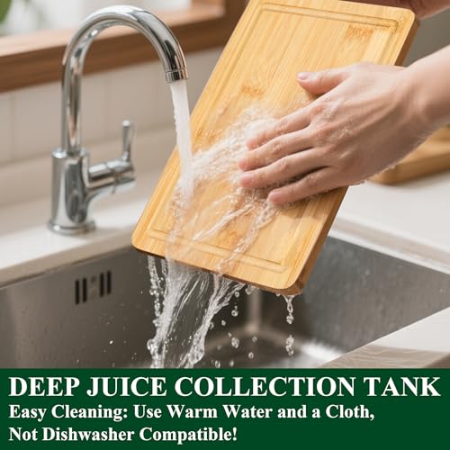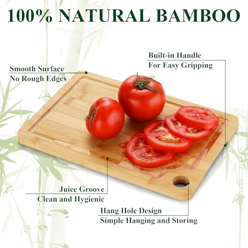 - Cleverly Crafted:This compact wooden chopping board features integrated handles for secure and comfortable grip. With its convenient hanging hole, it easily mounts on cupboard doors or hooks - doubling as both practical storage and a charming kitchen accent. The deep perimeter juice groove effectively catches excess liquids from meats, fruits or marinades, keeping your worktop clean and dry