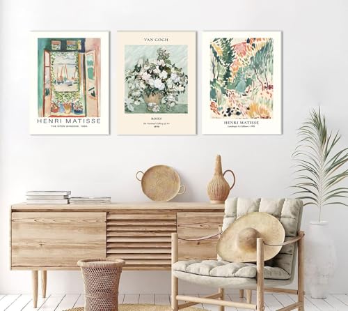 Hwetui - مجموعة لوحات فنية جدارية هنري ماتيس مؤطرة مكونة من 3 بوسترات خضراء تجريدية فان جوخ مطبوعة القماش بنمط ريترو لسوق الزهور لديكور الحائط اخضر 12 × 16 انش مؤطر