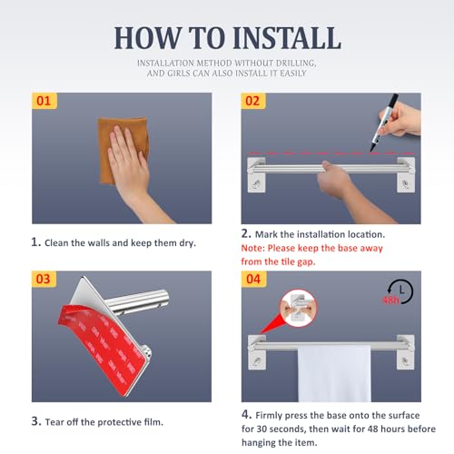- Easy and quick installation: towel rail without drilling. Applicable surfaces: clean, dry and smooth wall surfaces. Such as ceramic tiles, marble stone, metal, glass, etc. Not recommended for painted, wallpapered and uneven surfaces.