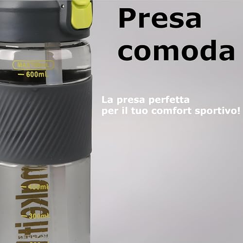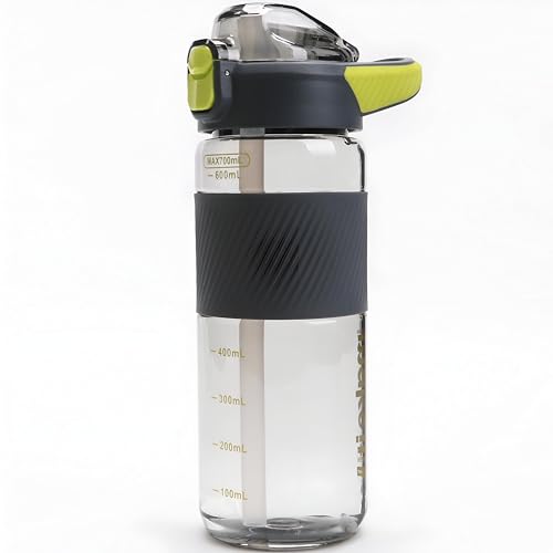 - 750 ml water bottle made of high-quality plastic with an integrated straw, features a leak-proof design and automatic safety anti-drip push-button cap, a safety lock anti-drop closure to prevent spills during transport, a wide mouth for ice cubes, and a compact ultra-durable handle in black, ideal for gym, sports, kids, and everyday hydration.