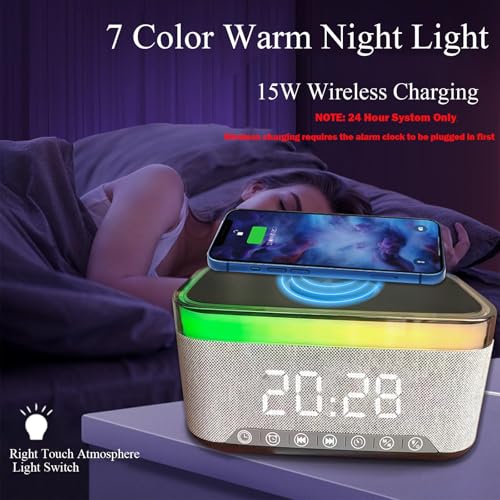 HYRAINBOW - Digital Alarm Clock with 15W Fast Wireless Charger, Alarm Clock Bluetooth Radio with 7 color light, Stereo Speaker Alarm Clock with 7 White Noise for Bedrooms, Desk, Bedside, Nightstand