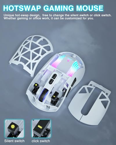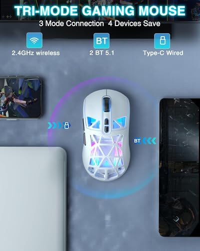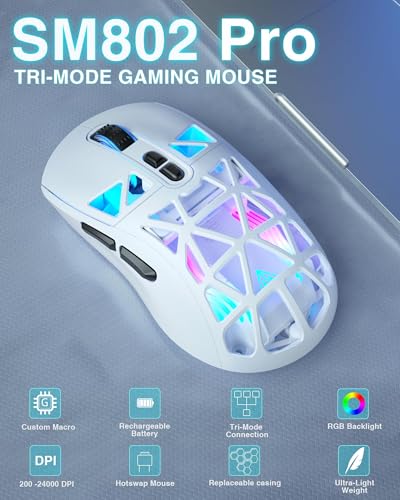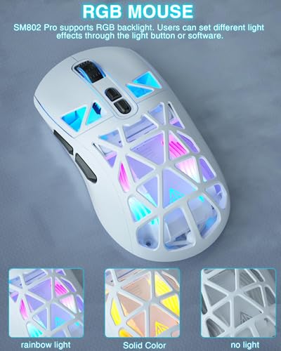 HYRAINBOW - ماوس العاب لاسلكي SM820 برو من هيرينبو، 24000 نقطة لكل انش، ثلاثي الاوضاع (لاسلكي/بلوتوث/سلكي) ماوس العاب ابيض مع زرين جانبيين، ماوس العاب ماكرو RGB قابل للبرمجة