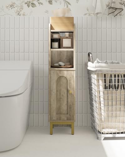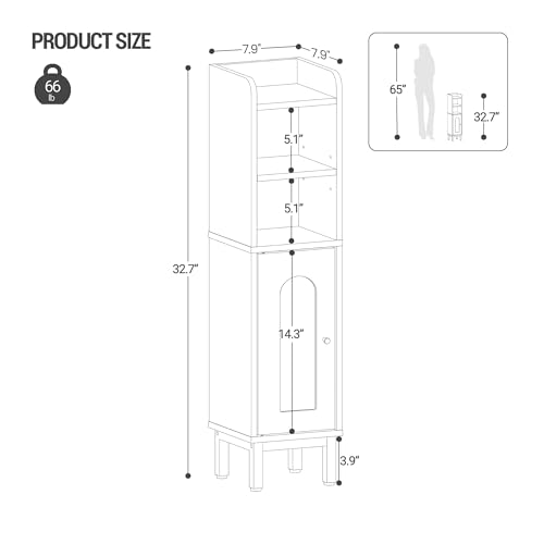 - - Suitable for Narrow Spaces: This sleek and space-saving bathroom cabinet, measuring 7.9"D x 7.9"W x 32.6"H, fits perfectly in narrow spaces, arched door design and four golden legs adding an aesthetic touch to your bathroom.