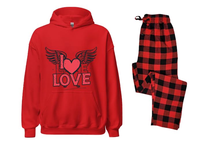 Generic - سويت شيرت بغطاء للرأس وبنطلون كاروهات مطبوع عليه عبارة I Love باللونين الأحمر والأسود، مقاس الزي من قطعتين (4 اكس لارج 4XL)