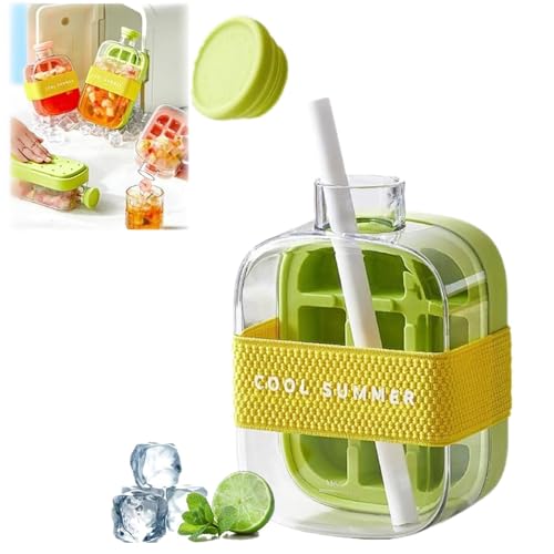 Veertutu - Ice Bottle Cup, 2 in 1 Zero Touch Press Ice Cube Mold Water Bottle with Lid and Bin, Ice Cube Bottle, Easy Press to Release Vertical Ice Cube Tray with Lid for Freezer (Green, 500ML)
