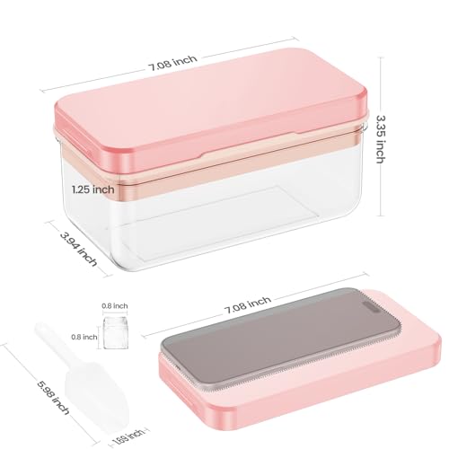 - 🍹[Saving Space ]Ice tray can be stacked and stored to save space. Contains: 1*32-pcs ice cube tray,ice scoop, lid, pillar plate, and ice cube storage bin that holds nearly 120 ice cubes.Size: 10.2 x 5.1 x 4.7".