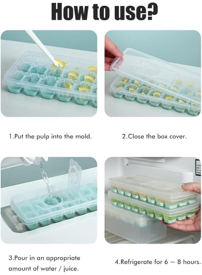 - Multiple Applications Ice Trays: You can use the ice tray to cool your cocktails, whiskeys, iced coffee, juice or filling the molds with drinks, fruit, yogurt, jelly, and chocolate to customize your favorite flavor. Fill the trays with water, cover the lid on, and then slip the trays into the freezer, then you can look forward to your delicious!