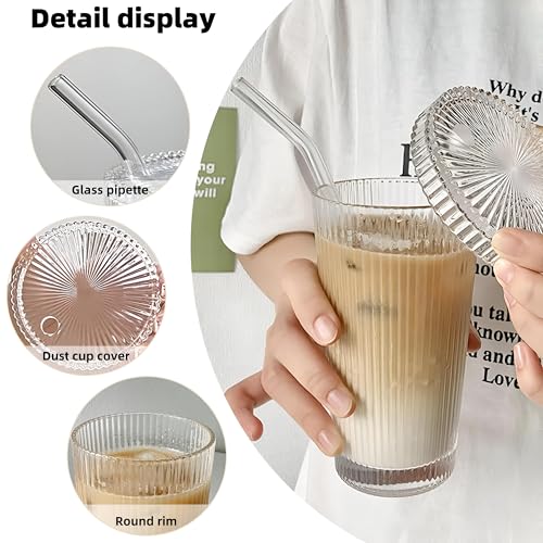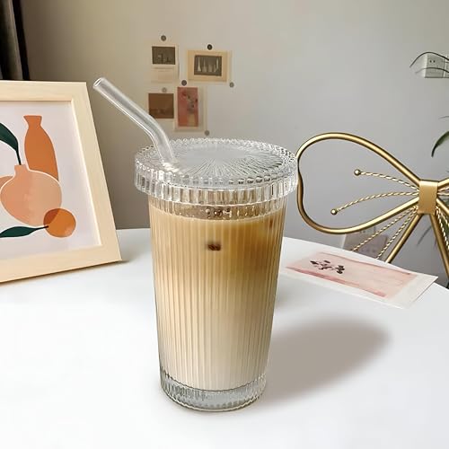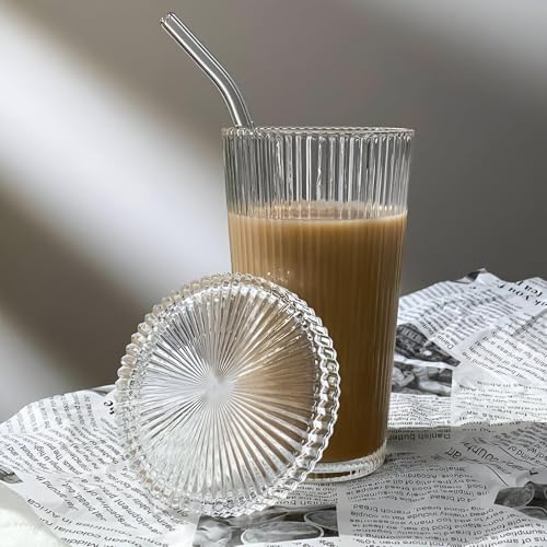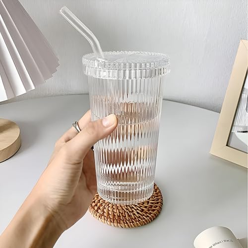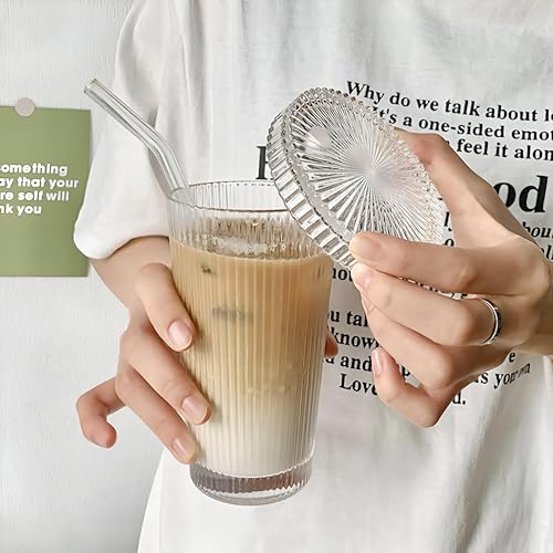 Generic - كوب قهوة مثلجة - زجاج انيق 360 مل مع غطاء وماصة، لمسة نهائية مخططة لمظهر منعش، مناسب لللاتيه البارد او الحليب المخفوق او العصائر او الشاي، رفيق مثالي للمشروبات الصيفية.
