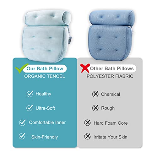 - ULTRA-SOFT ORGANIC TENCEL: A revolutionary improvement in material! Forget those plastic, vinyl or rough tub pillow that irritate and scratch your skin, we adopt OEKO-TEX approved tencel fabric, which is known for its amazing softness and natural comfort. It will bring your bathing experience to a whole new level.