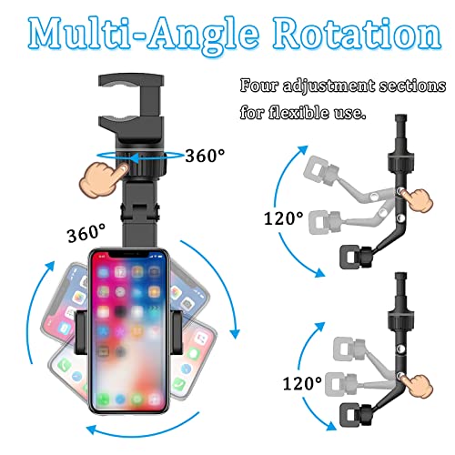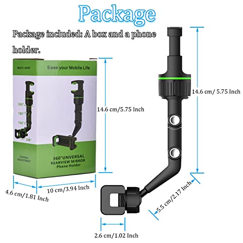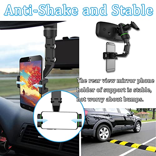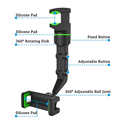 - 360°+120° Rotation - The rearview mirror phone holder for car with a 360° rotating disk and a 360° adjustable ball joint, can be adjusted freely, which is convenient for you to navigate while driving or watch videos while resting. And the arm of the car holder for cell phone has two 120° adjustments button, which can adjust the height of the mobile phone, and it can be rotated up when not in use. The phone mount holder will not interfere with your vision and will not affect driving safety.