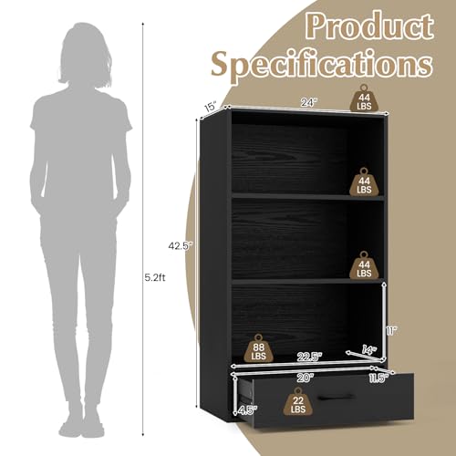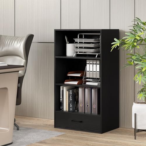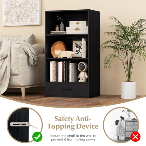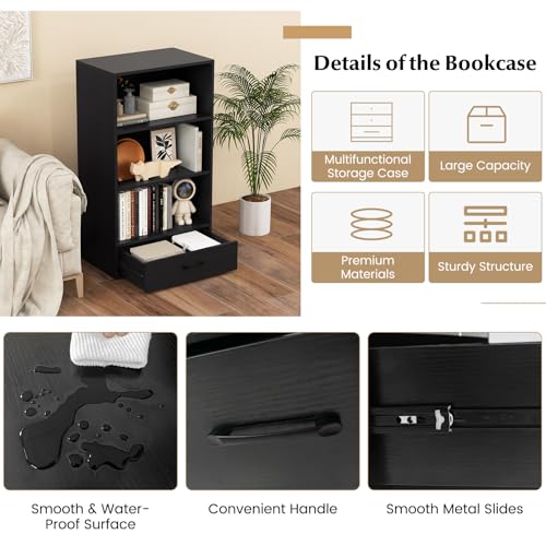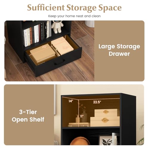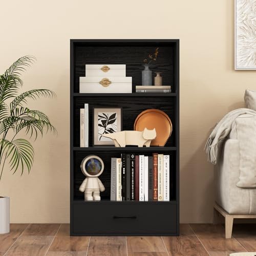IFANNY - 3 Shelf Bookcase with Drawer, Wood Bookshelves and Bookcases, Cube Storage Shelf, Small Bookshelf for Small Spaces, Modern Book Shelf for Bedroom, Living Room, Home Office (Black)