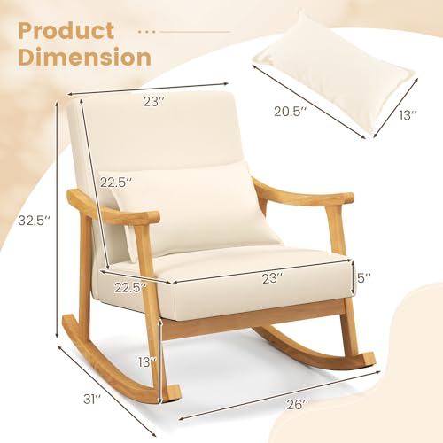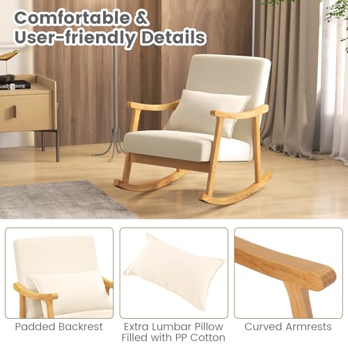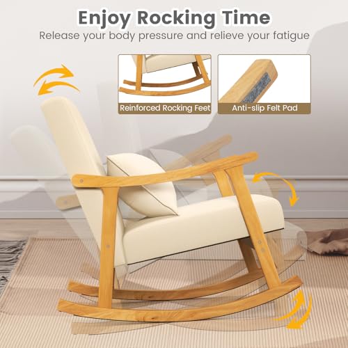 IFANNY - Upholstered Rocking Chair, Modern Glider Rocker with Lumbar Pillow & Rubber Wood Legs, Wooden Recliner Rocking Accent Armchair Chair for Living Room, Bedroom, Nursery (1, Beige)