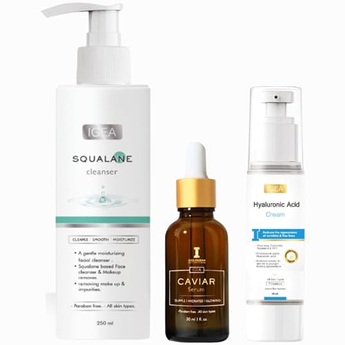 Igea - مجموعة العناية بالبشرة - منظف السكوالين (250 مل) وكريم حمض الهيالورونيك (40 مل) وسيروم كافيار (30 مل) مع الكافيار الأسود والأعشاب البحرية | تقلل التجاعيد والخطوط الدقيقة من ايجيا