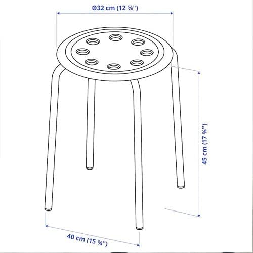 - كرسي ماريوس موديل رقم 104.158.10، العرض: 43 سم (17 بوصة) ارتفاع: 4 سم (1 ¾ بوصة) الطول: 46 سم(18 بوصة)، الوزن: 1.80 كجم (3 رطل، 15 اونصة)