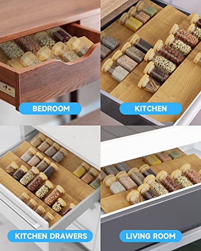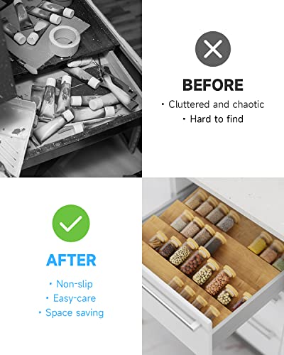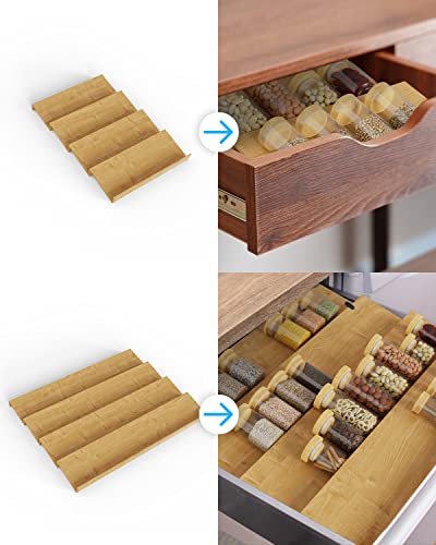 - 【Fits All Drawers Perfectly】Designed to accommodate all types of drawers well, this bamboo spice rack organizer for the cabinet can hold several 4 oz. jars depending upon the size. Incredibly durable and long-lasting, the spice rack drawer organizer is very sturdy.