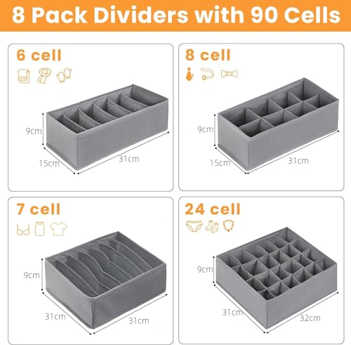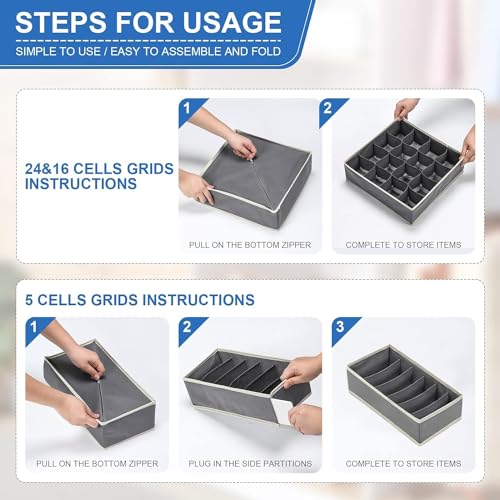 - LARGE CAPACITY DRAWER ORGANIZER This foldable drawer organizer set includes 4 different containers. 24 cell / 7 cell / 6 cell / 8 cell storage box. Can be used to store socks, women's bras, baby clothes, underpants, socks, handkerchiefs. Ties, Belts These organizer bins can meet all your needs for organizing small things