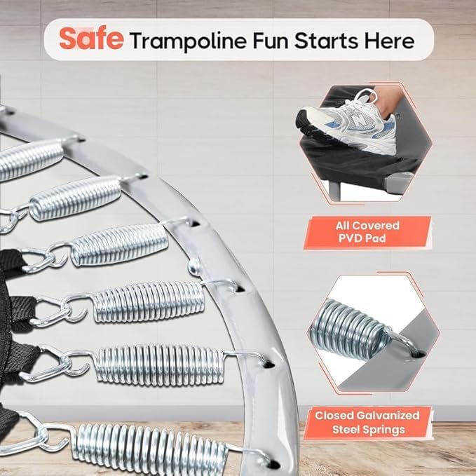 - DURABLE HIGH-RESILIENCE JUMPING MAT – The strong, high-resilience PP jumping mat is securely attached with multiple springs, providing durable support and a spacious surface for a safe, enjoyable jumping experience.