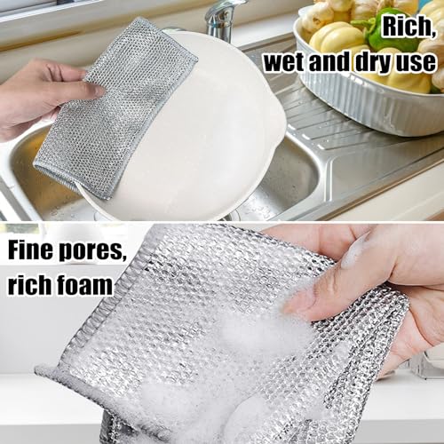 - Versatile Wet and Dry Cleaning: Thanks to the fine-hole design, these wire dishwashing rags for wet and dry create a rich lather when wet, perfect for efficiently cleaning tableware and pots. Alternatively, use them directly to tackle grills, stoves, and more. These cloths are ready for any cleaning task.