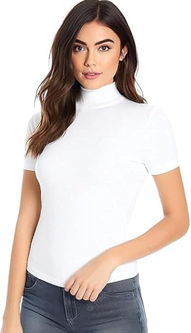 Generic - Incotone High Neck Short Sleeve Top, White, Fitted Style,XL