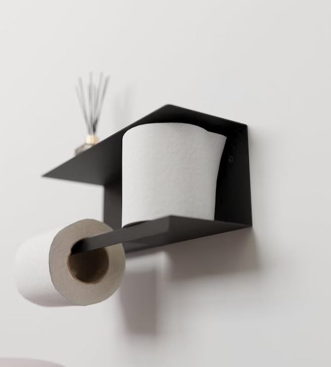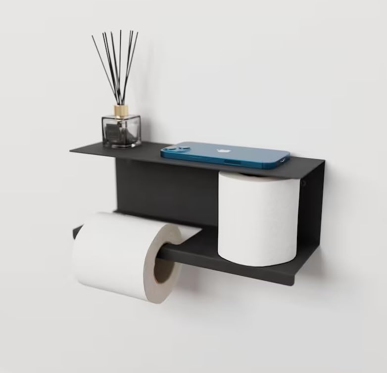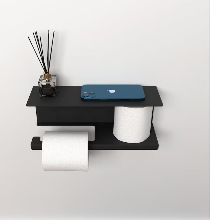 - Our innovative Bathroom Shelf is more than just a toilet paper holder—it's a space-saving organizer perfect for contemporary bathrooms. Featuring a minimalist design, the top section serves as a multi-functional space where you can place your phone, air freshener, or even a book. Meanwhile, the lower shelf is intelligently crafted to hold your current toilet paper roll and accommodate spare rolls.