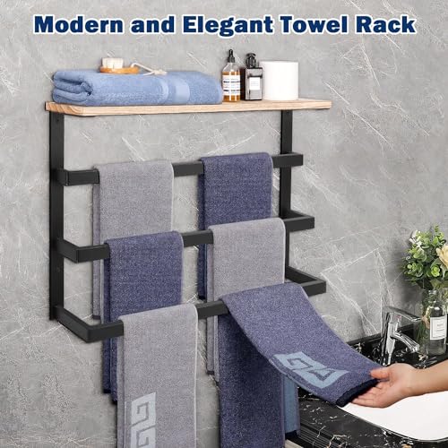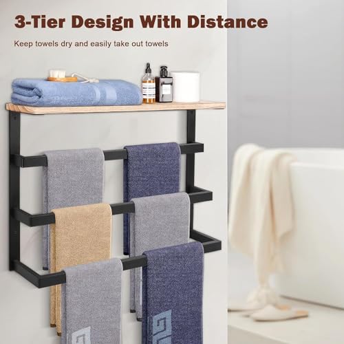 INDIDECOR - رف فوط معدني سميك معلق برف خشبي مع 3 شماعات وحامل مثبت على الحائط، اكسسوارات منظم ديكور الحمام من انديدكور، طول 61 سم، لون أسود مطفي