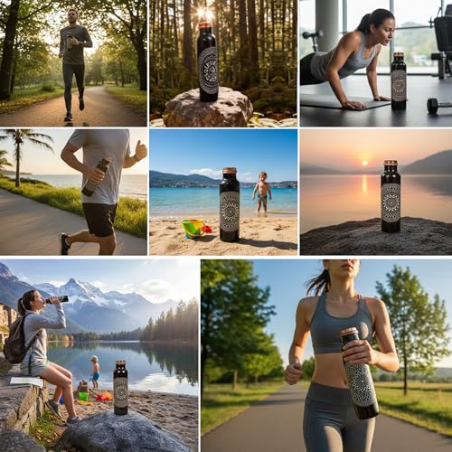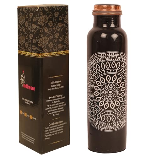 INDTRESOR - INDTRESOR Pure Copper Water Bottle - Handcrafted - Ayurveda health benefits - Large 35 oz - Leak proof - Easy to carry for Sports, Fitness, Yoga, School - Ethnic Rangoli Inspired Black Base Enamel