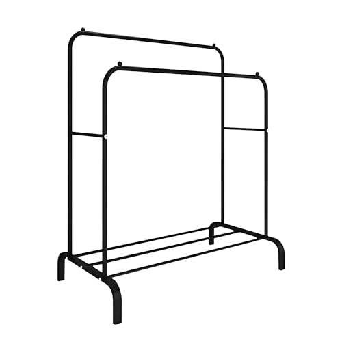 - This dual-purpose metal clothing rack features a sturdy vertical frame and a lower shelf, designed to efficiently organize coats, jackets, and accessories while maximizing space in bedrooms or living areas.