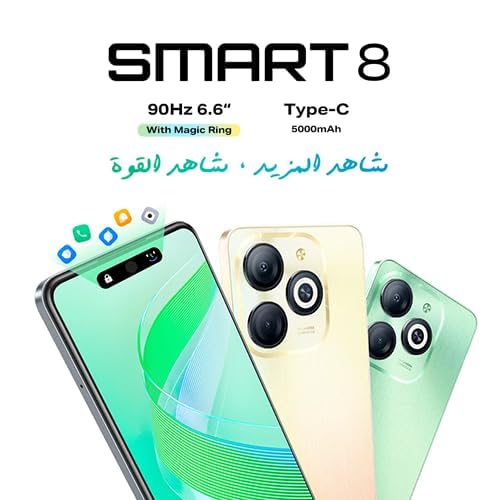 Infinix - موبايل انفينيكس سمارت 8 (RAM:2+2GB، ROM:64GB)، شاشة 6.6 بوصة HD+، كاميرا خلفية AI مزدوجة 13MP مع مصباح دائري، كاميرا أمامية 8MP، بطارية 5000mAh، شريحة نانو مزدوجة، نوع سي، (صنع في مصر) (ذهبي لامع)