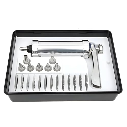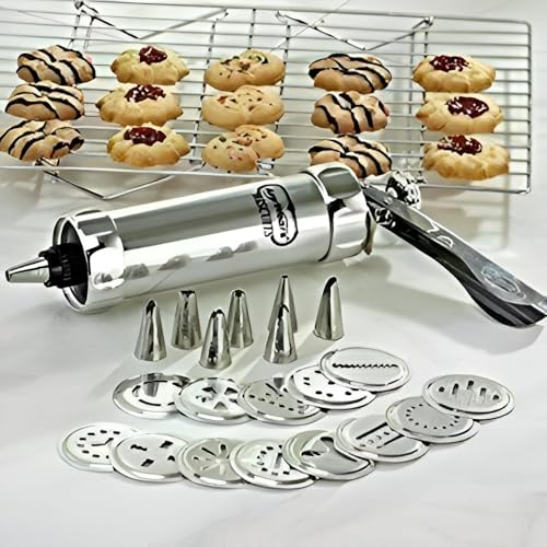 - Includes 20 interchangeable aluminum cookie plates and 4 APS nozzles, letting you create a wide range of shapes—from stars and flowers to leaves—in a single press.