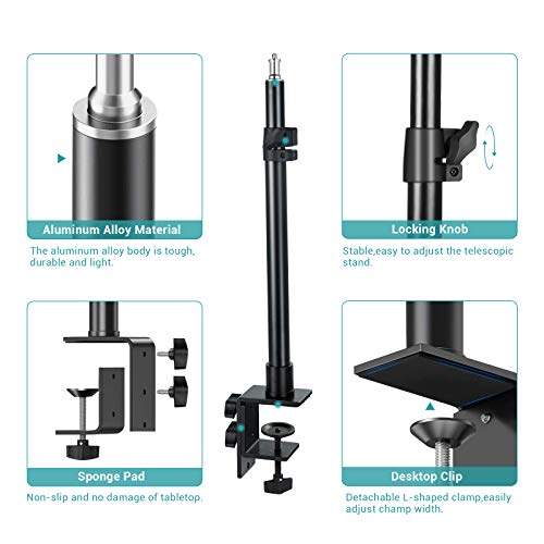 - Standard 1/4'' Screw: The tabletop light stand features with standard 1/4 "screw with 360° Rotatable Ball Head, versatile, easy to assemble, and clamp to the desk. It supports most photo lighting devices such as smartphone clamps, microphones, LED light, ring light, action cams, monitors, webcams, DSLR cameras, etc.