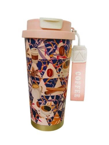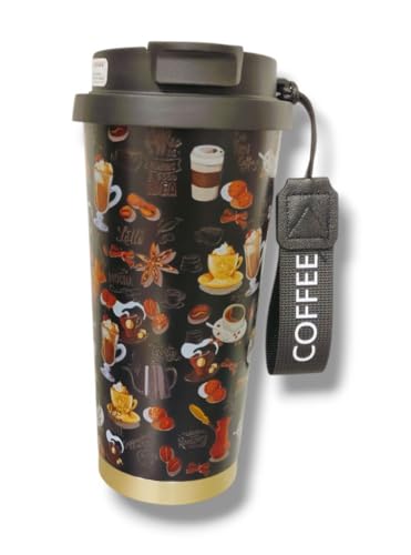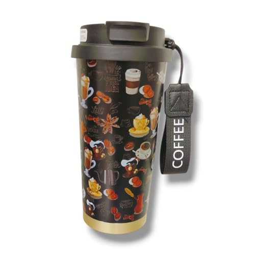 Generic - Insulated Steel Travel Mug with Strap, Coffee Theme Pattern Design, 500ml, Black and Gold