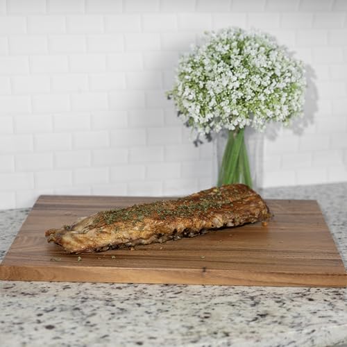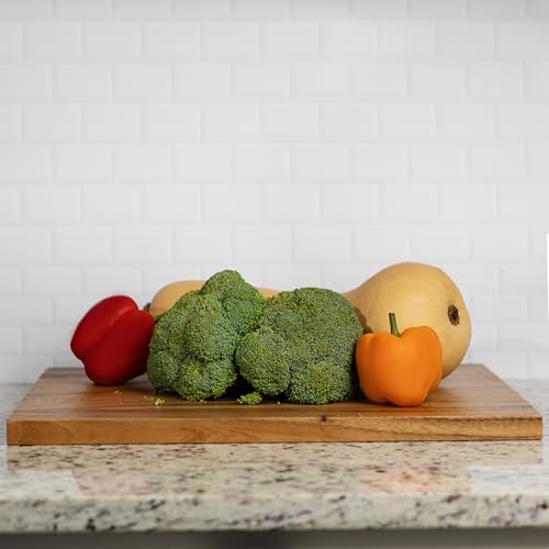 - RECTANGULAR CUTTING BOARD: This acacia wood cutting board is perfect for chopping, carving, and cutting! The board includes a juice well for carving meat, a wide 20” x 14” size to provide ample chopping space, and its beautiful design means it can be used for serving as well!