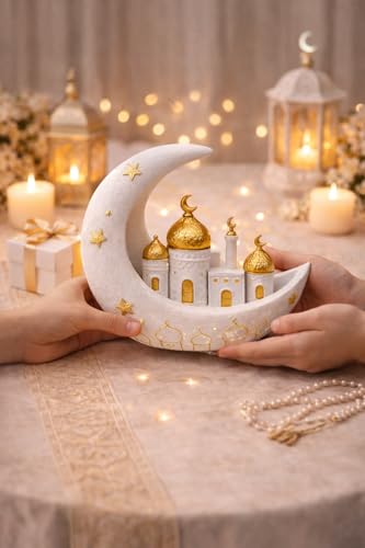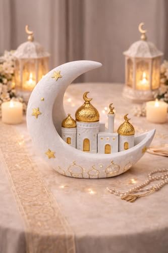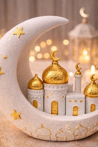 - صميم أنيق على شكل هلال يحتوي على مجسم مسجد ألوان هادئة (أبيض وذهبي) تعطي شكل فخم مناسب لديكور المنازل والمكاتب يضيف أجواء روحانية جميلة مثالي لزينة رمضان والعيد