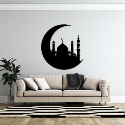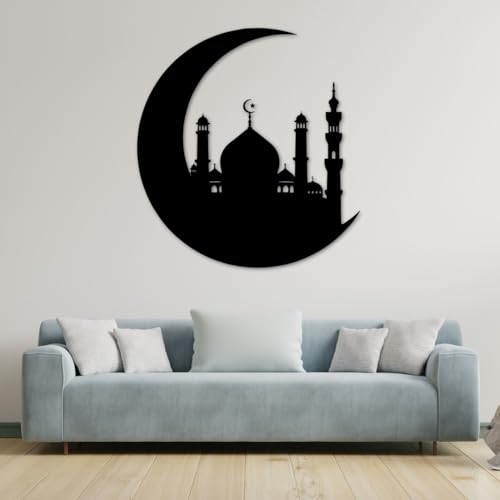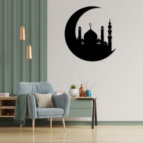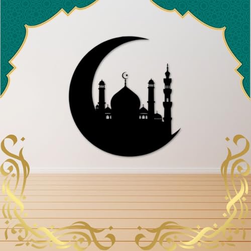 - ELEGANT DESIGN: Features a striking black metal silhouette of a mosque nestled within a crescent moon, creating a sophisticated Islamic aesthetic