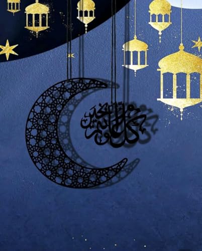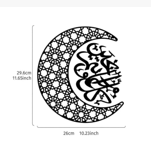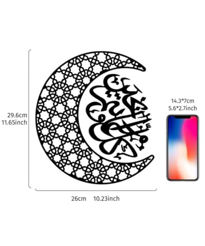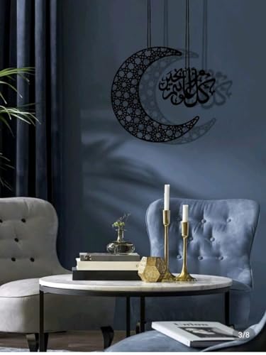 - تصميم أنيق: هلال معدني أسود مفصل بشكل معقد يتميز بأنماط هندسية وخط عربي جميل، مثالي لديكور المنزل الإسلامي الحديث