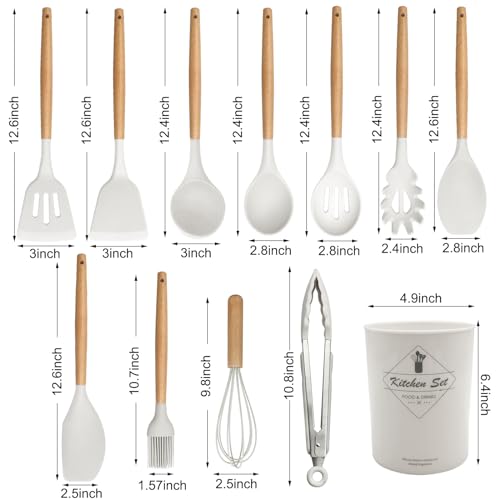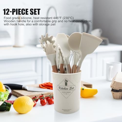 Ismosm - Cooking Utensils Set of 12 Silicone Kitchen Utensils With Solid Wood Handles and a Holder Bucket (Milk White)