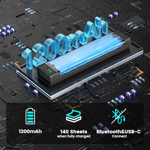 - Large Battery Capacity:With 1200mAh rechargeable battery, the portable thermal printer can print up to 140 sheets when fully charged! With the USB Type-C power line, you can easily charge your mobile printer using a laptop or any other USB port. No need to worry about running out of power while working!