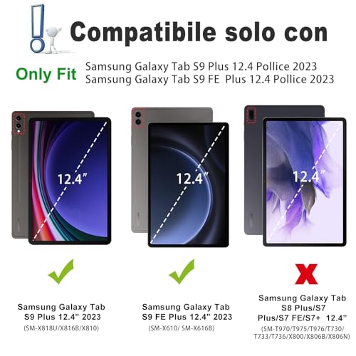 - جراب بلوحة مفاتيح لجهاز سامسونج تاب S9FE/S9 بلس مقاس 12.4 بوصة إصدار 2023: جراب حماية بلوحة مفاتيح لسامسونج جالاكسي تاب S9 بلس 12.4 بوصة إصدار 2023 (SM-X810 / X816B / SM-X818U)، متوافقة مع جهاز سامسونج جالاكسي تاب S9 FE بلس بمقاس 12.4 بوصة – إصدار 2023. (SM-X616B / X616B) — يمكنك العثور على رقم طراز التابلت في أسفل الجزء الخلفي من الجهاز. يرجى التحقق قبل الشراء. (القلم غير متضمن)