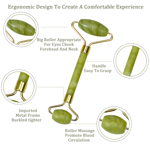 - 【Jade Face Roller】 The face & eye roller is sturdy and no squeaky. The massager roller is very smooth and well-made. It provides cooling and energizes the skin.This face roller can be left in the fridge. The jade guasha stone easily gets cold & your face will get additional lymphatic drainage.